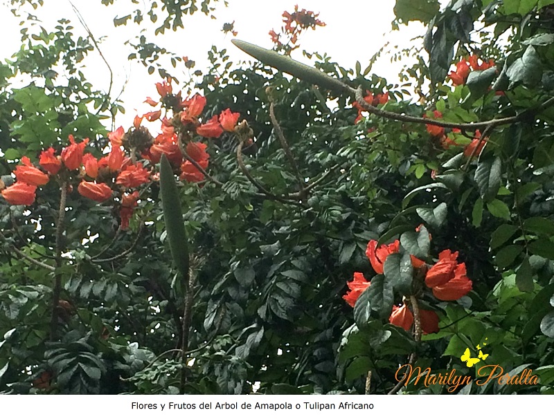 Flores y Frutos del Arbol de Amapola o Tulipan Africano