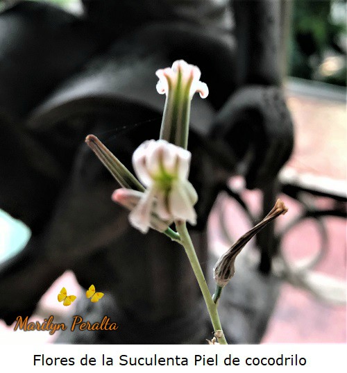 Las flores de la suculenta Piel de cocodrilo son pequeñas, tubulares, color blanco lila y aparecen en el centro de la planta, sostenidas por un largo tallo floral de unos 20 a 30 centímetros de longitud.