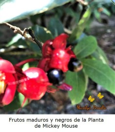 Los frutos de la Planta de Mickey Mouse, al madurar, se vuelven color negro. Dentro tienen una semilla. Estos frutos son muy apetecidos por las aves.
