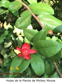 Las hojas de la Planta Mickey Mouse son de forma ovalada elíptica. Su color es verde brillante cuando adultas y cuando jóvenes son color rojizo. Tienen el borde con dientes.