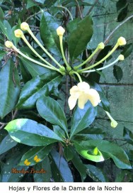 Las hojas del arbusto de Dama de la Noche son gruesas y flexibles, es decir, coriáceas. su forma es elíptico ovalada y de márgenes enteros. En el envés tiene pequeños pelos.