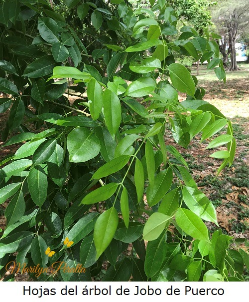Las hojas crecen agrupadas en los extremos de las ramas. Son caducas, compuestas cada una por 9 a 25 hojillas o folíolos brillantes, ovalados y con ligeros dientes. En un momento, cuando los frutos empiezan a formarse, las hojas van cambiando su color a amarillo y caen, quedando el árbol solo con los frutos.