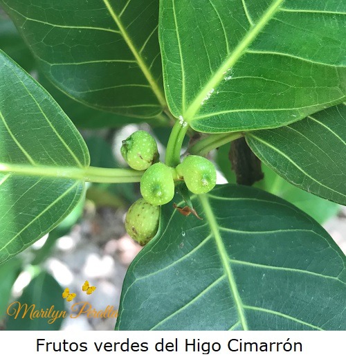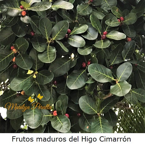 Produce unos frutos o higos pequeños. Al principio son color verde y si las flores son polinizadas por un insecto en particular, maduran y se vuelven color rojizo o púrpura y de consistencia carnosa. Cada especie de ficus tiene un insecto polinizador específico.