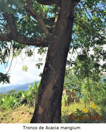 El tronco del árbol de Acacia mangiun es recto y de corteza fisurada color marrón oscuro. Su madera es muy usada en muebles y artesanía.
